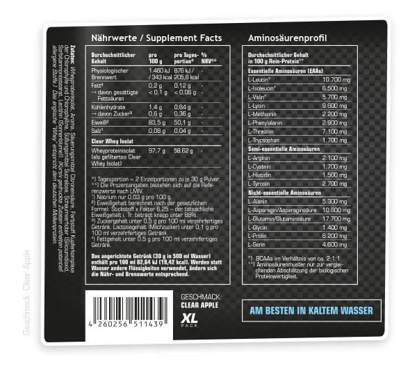 Unser Aqua Clear Whey von SRS Nutrition besteht je nach Geschmacksrichtung zu ca. 97% aus hochwertigem Wheyproteinisolat in der speziell gefilterten Clear Version. Der offizielle Eiweißgehalt berechnet nach der gesetzlich vorgeschriebenen Formel (Stickstoff x Faktor 6,25) ergibt ca. 83 g pro 100 g Pulver. Der tatsächliche Eiweißgehalt in der Trockenmasse liegt bei ca. 88%. Durch die spezielle Filterung sind störende Anteile der Molke nochmals entfernt, so dass das Aqua Clear Whey mindestens so gut verträglich ist wie ein reines Whey Isolat und zugleich ohne Trübung und ohne bestimmte Geschmackskomponenten noch erfrischender und leckerer wird. Das Aminosäurenprofil mit über 46% EAA-Anteil und knapp 23% BCAAs im optimalen Verhältnis von ca. 2:1:1 überzeugt dabei auf ganzer Linie.