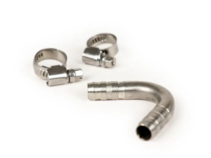 Benzinschlauchkrümmer von BGM aus Edelstahl. Erstmalig unter der Verkaufsbezeichnung ‘Ron Bogen’ im German Scooter Forum angeboten. Dieser wird direkt nach dem Benzinhahn in den Schlauch gesetzt und bietet durch eine 55° Umlenkung eine wesentlich bessere Anschlussmöglichkeit für den Benzinschlauch. Damit wird ein abknicken des Schlauches effektiv verhindert, der Motor erhält immer die volle Ladung frisches Benzin. Die Montage erfolgt so nah wie möglich am Abgang des Benzinhahns. Dazu ein kurzes Stück Benzinschlauch (ca. 3-4cm) am Benzinhahn anbringen, dann den Benzinschlauchkrümmer und daran den restlichen Schlauch zum Vergaser. Passend für den Standard Piaggio Benzinschlauch mit Ø7mm Innendurchmesser Wird inklusive Schlauchschellen ausgeliefert TIP: Grundregel für die Verlegung des Schlauches: So kurz wie möglich so lang wie nötig. Immer erst den Schlauch am Tank/Bogen befestigen, den Tank einsetzen und erst dann mit dem Vergaser verbinden. Nur so kann die kürzest mögliche Schlauchlänge realisiert werden. Eine gute Alternative zum originalen Benzinschlauch ist der spiraldrahtverstärkte Toyox Schlauch (siehe Zubehör). Dieser ist durch die eingearbeitete Verstärkung eine ideale Ergänzung. Für eine leichtere Montage die Enden erwärmen.