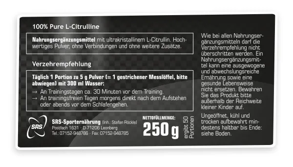 L-Citrullin ist nicht gleich Citrullin. Deshalb haben wir den kompromisslosesten Rohstoff ausgesucht, den man finden kann. Unser reinstes L-Citrullin von SRS-Nutrition ohne Malat-Verbindung sorgt für 30% mehr Citrullin im Vergleich zu herkömmlichen Produkten! Das ultrakristalline Pulver ohne jegliche Zusätze wird mittels natürlicher Fermentation aus reinem Mais gewonnen und ist 100% vegan.